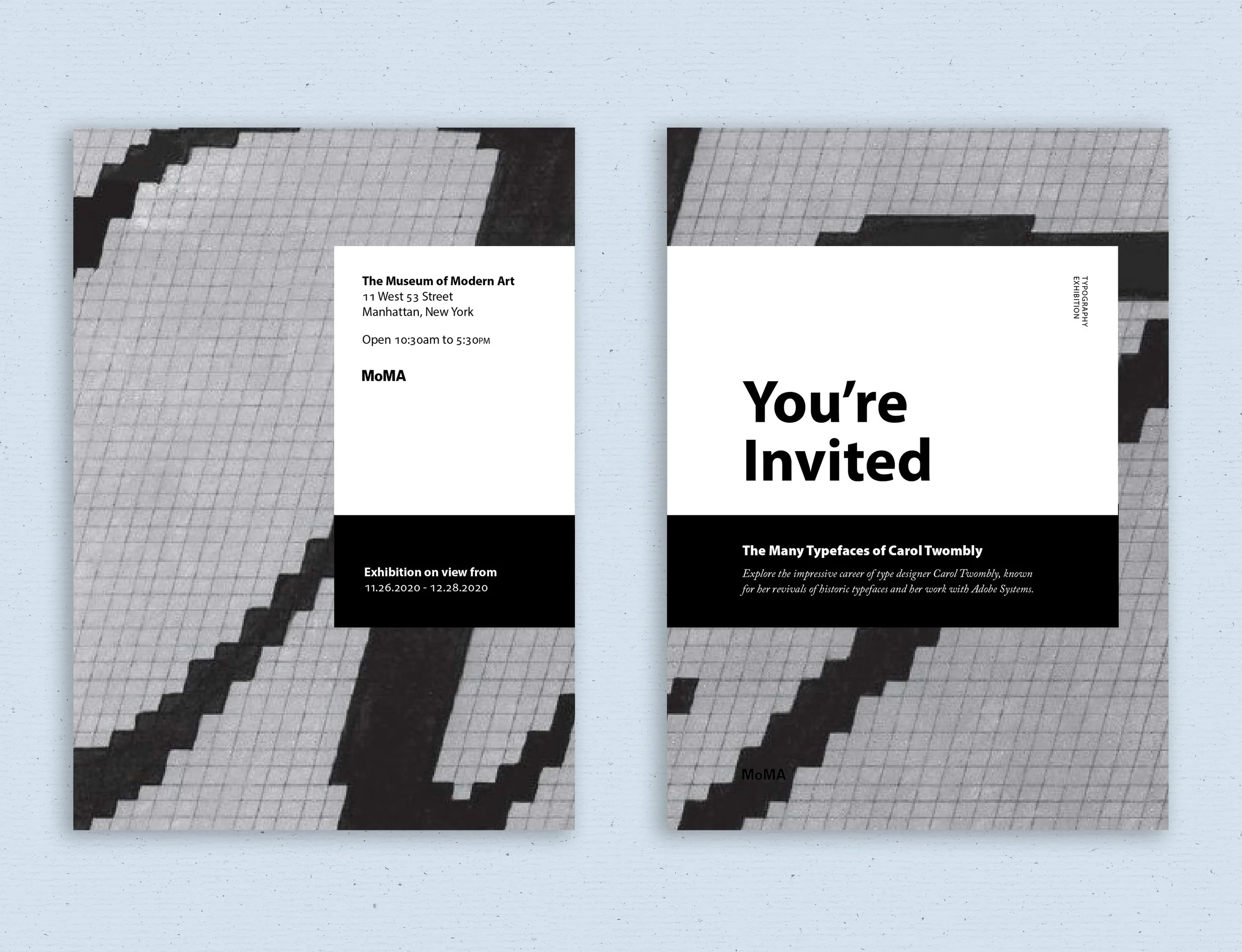 This is a concept for a museum exhibition that showcases the work of type designer Carol Twombly. Twombly worked as a type designer at Adobe Systems from 1988 through 1999. Some of her most famous typefaces are inspired by historic type designs from the past, including Adobe Caslon, Trajan, Charlemagne, and Lithos.